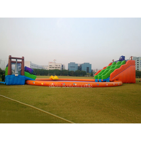 เด็ก N ผู้ใหญ่ปลาหมึกพองสวนน้ำบนบกที่มีสระว่ายน้ำขนาดใหญ่พอง N ปลาหมึกยักษ์สไลด์