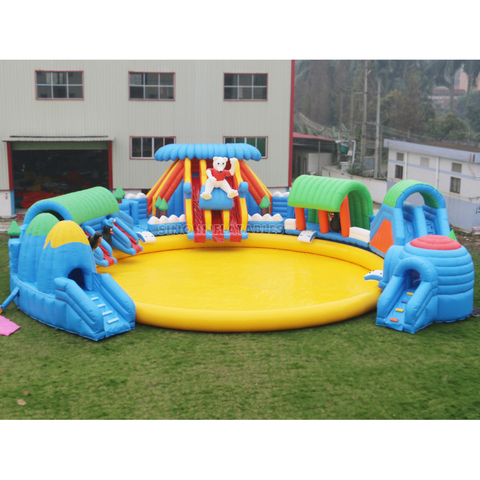 9X6.5M เชิงพาณิชย์เกรดพื้นดินสวนสนุกน้ำทำให้พองด้วยสไลด์ N สระว่ายน้ำสำหรับเด็กและผู้ใหญ่จากประเทศจีนโรงงานสวนพอง